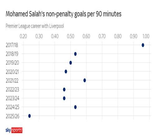 让我们来看看以下数据,自从加盟利物浦以来,萨拉赫场均参与进球数(不包括点球)非常稳定,这证明了他作为英超顶级球员的地位,而在本赛季,萨拉赫的这一数据断崖式下滑。