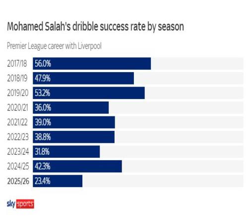 萨拉赫为什么无法频频过人了?卡拉格认为萨拉赫体能下降,尽管听上去有些残酷,但那个过人如麻的边锋已经成了过去式。在本赛季,萨拉赫的突破成功率低于25%,这是其8年利物浦生涯第一次低于25%。