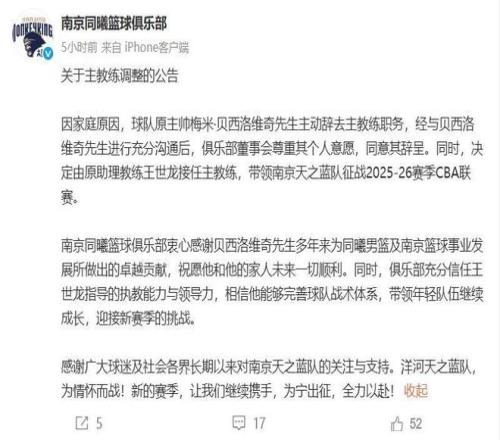 CBA新赛季还未开始,就已经有球队的主教练下课了。没错,就是那个网红球队南京同曦队。上赛季常规赛刚打没几场比赛,球队的主教练西热力江宣布辞职离队,随后外籍助教贝西洛维奇成为球队的主教练,并且带领球队首次进入季后赛。不过这段时间因为同曦队在俱乐部杯赛上遭遇三连败,贝帅被迫辞职,助理教练王世龙接棒成为同曦队新任主教练。